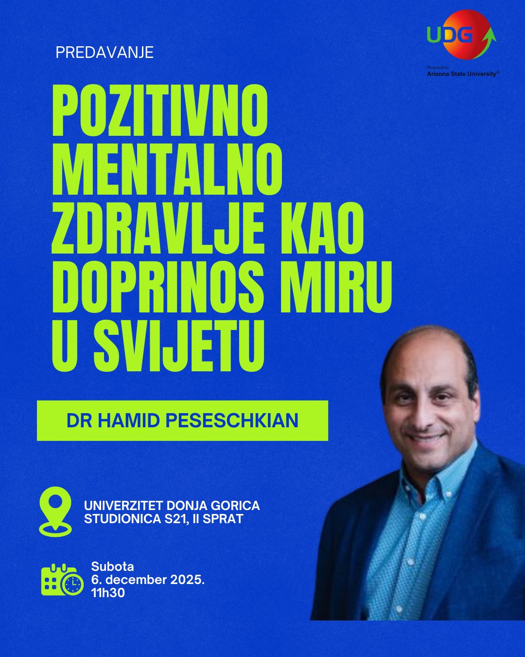 Sa zadovoljstvom vas pozivamo na predavanje dr Hamida Peseschkiana na temu „Pozitivno mentalno zdravlje kao doprinos svjetskom miru“. Predavanje će se održati na Univerzitetu Donja Gorica, u subotu, 6. decembra u 11:30, u studionici S21, na drugom spratu.